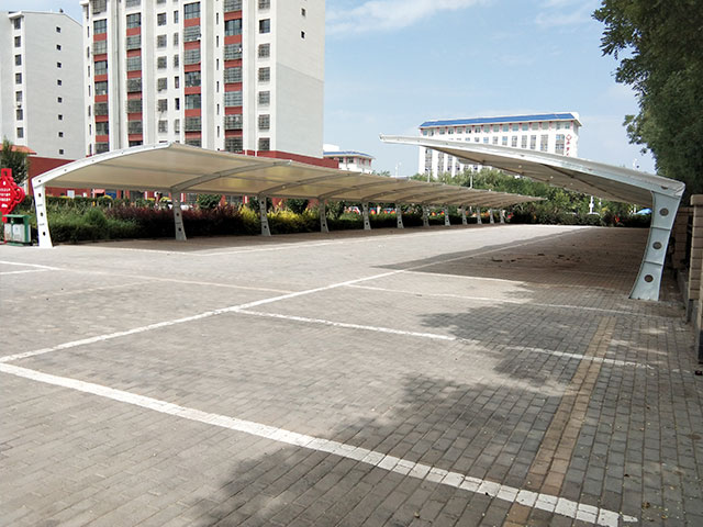 膜的高反射率使其成为屋顶玻璃系统的理想替代品,张力膜结构汽车棚通常使用聚氯乙烯/聚酯或聚四氟乙烯涂层进行加固,这也使得结构在防火性能方面表现良好,带有聚四氟乙烯涂层的张力膜结构被认为是易燃的,使其安全。
